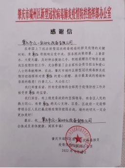 矿泉水和大米一批,价值2万元,捐赠到端州区、高要区防疫部门 |